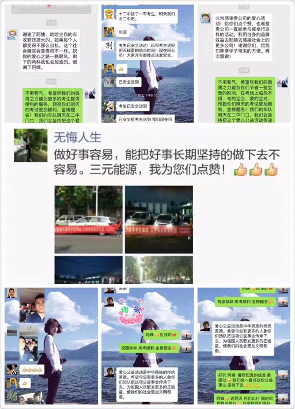 三元人懷揣著激動(dòng)而又心安的心情,此屆愛(ài)心***公益活動(dòng)***結(jié)束在此,也感謝所有三元能源的家人們,謝謝你們這兩天辛勤地的付出,同時(shí)讓每一位三元人也切身體會(huì)到的更多的是滿(mǎn)滿(mǎn)的感動(dòng)和愛(ài)。兩天雖短,卻讓我們收獲頗豐,更得到了社會(huì)各界的支持和贊譽(yù),尤其是來(lái)自考生和家長(zhǎng)發(fā)自肺腑的感謝和真摯的祝福期間所有感動(dòng)的瞬間,大愛(ài)的流露太多太多!期間我們遇到了一位家長(zhǎng),她的一雙兒女,兩年都是分別被我們車(chē)隊(duì)接送,今年是她的女兒;我們一大早六點(diǎn)就起來(lái)在新鄉(xiāng)市公交站牌、小區(qū)門(mén)口等候接送,家長(zhǎng)知道我們起得早,第二天考試直接給我們準(zhǔn)備了一大袋的鹵雞蛋,說(shuō)句心里話,這一次是我們吃過(guò)***好吃的鹵蛋…等等…太多太多的感人事跡和關(guān)于愛(ài)和緣分的故事很慶幸擁有三元能源這個(gè)大家庭,也很慶幸每一位三元人都能真正靜下心來(lái)去踐行這份公益事業(yè),同時(shí)我們?nèi)茉垂靖鼤?huì)堅(jiān)定不移地把這份愛(ài)心公益活動(dòng)傳承下去***后,祝愿所有2017年的高考生們:愿你們合上筆蓋的那一刻,有武士將刀收回劍鞘般的驕傲未來(lái),我們一起加油!